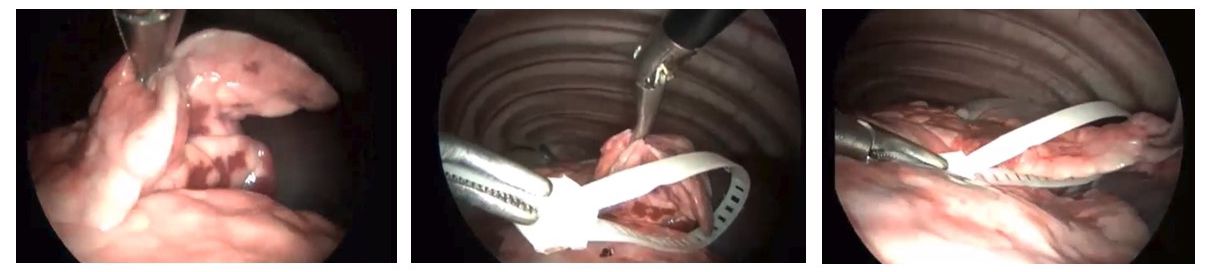 Images from video. The lung lobe was passed through the LigaTie® loop, the loop was tightened which compressed tissue, where after the lung lobe was removed.